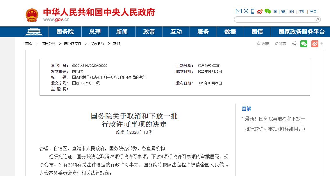 國務院關于取消和下放一批​行政許可事項的決定 國發〔2020〕13號